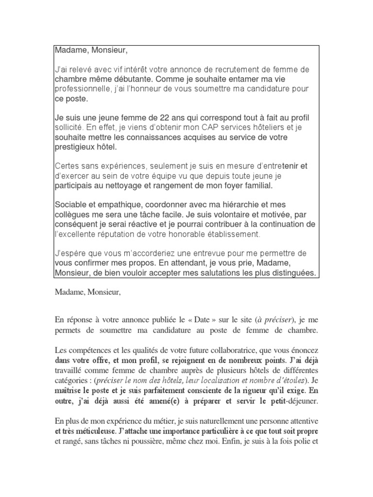 Candidature au poste de valet femme de chambre. Home lettre de motivation lettre de motivation femme de chambre sans expérience lettre de motivation femme de chambre sans expérience je veux recopier les méthodes en lisant ces livres pour trouver un emploi ici lettre de motivation femme de chambre sans expérience. La lettre de motivation est un outil important pour toute candidature ne la négligez pas.