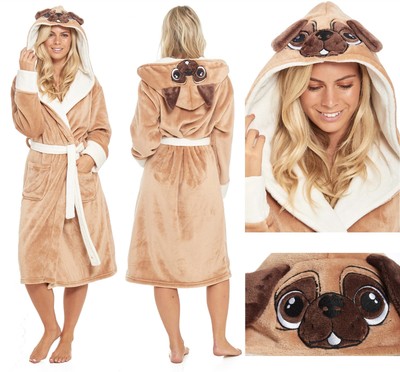 Pug Dog Dressing Gown Fleece Ladies Womens Hooded Luxury Brown